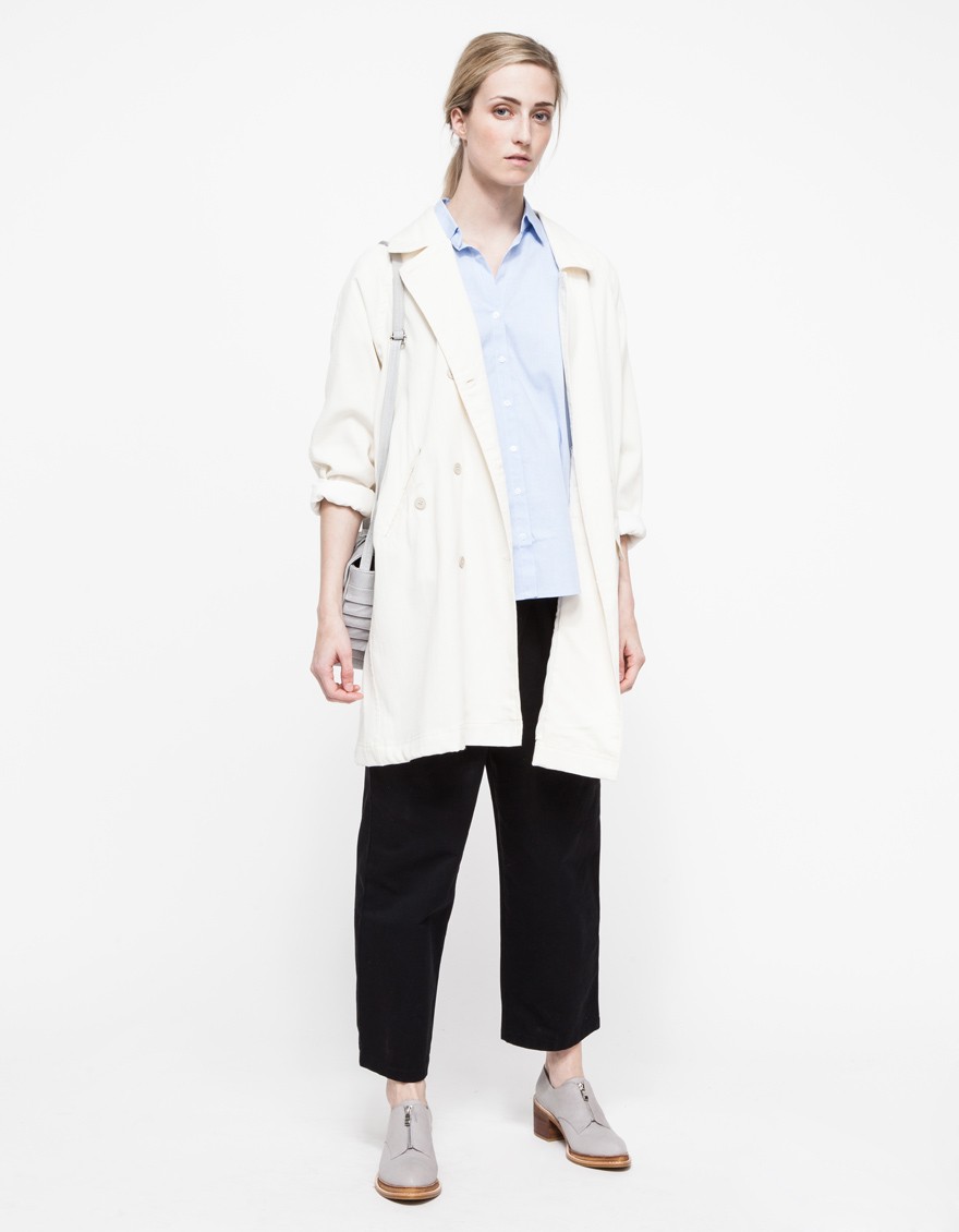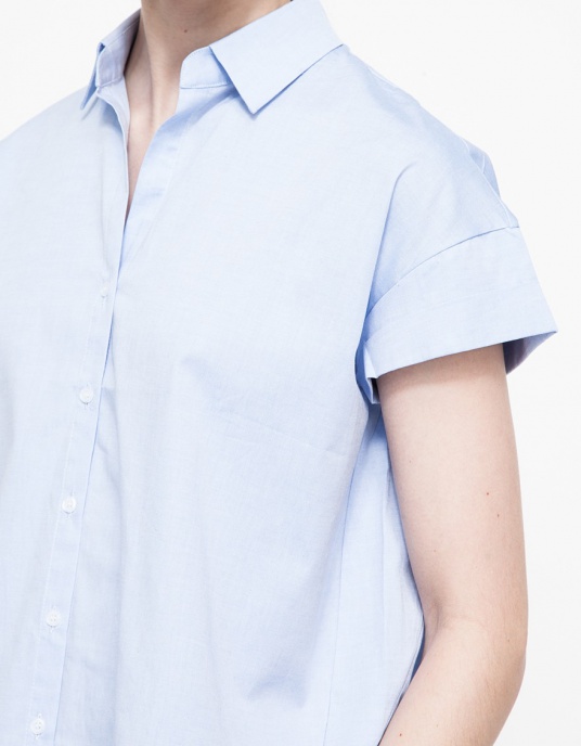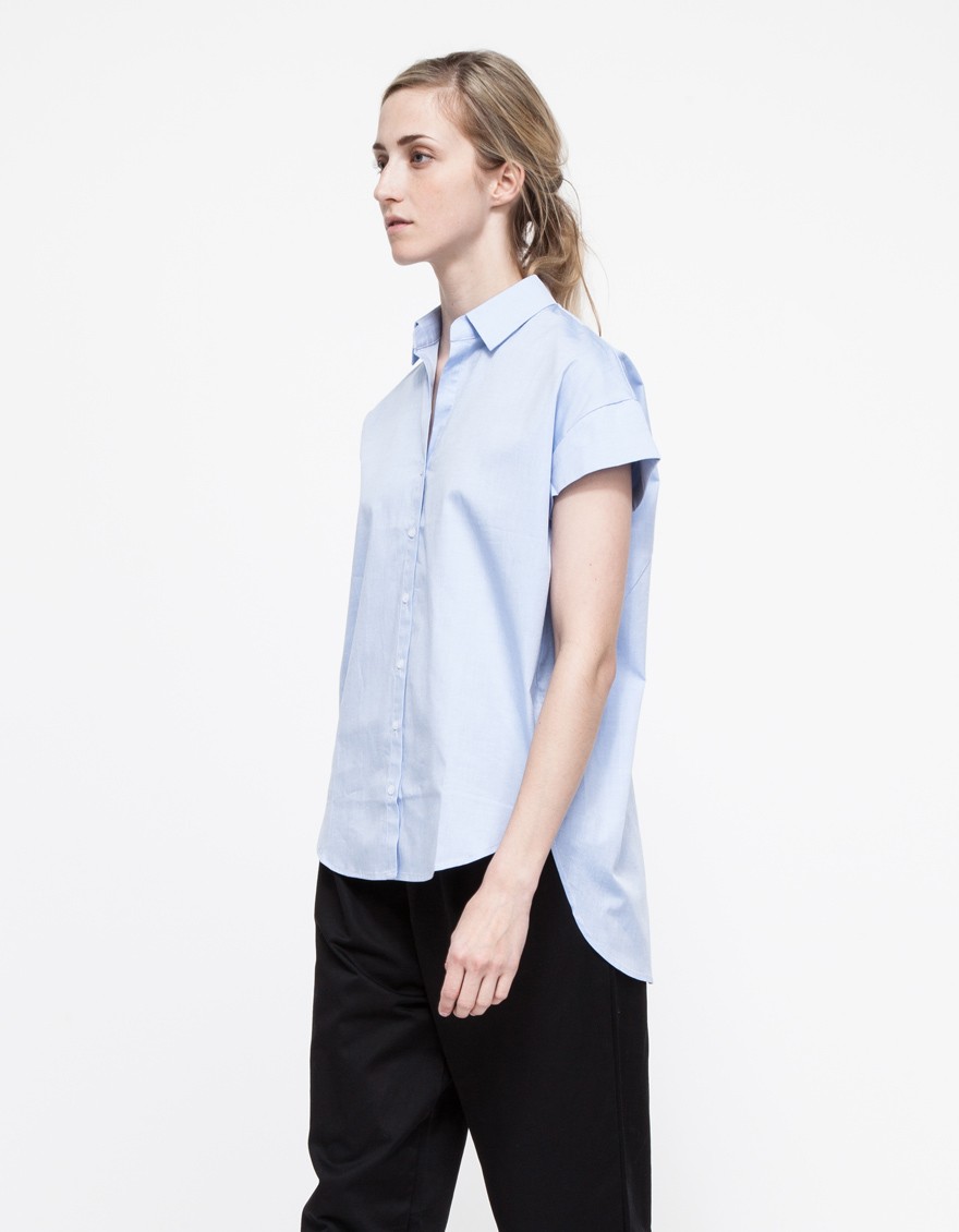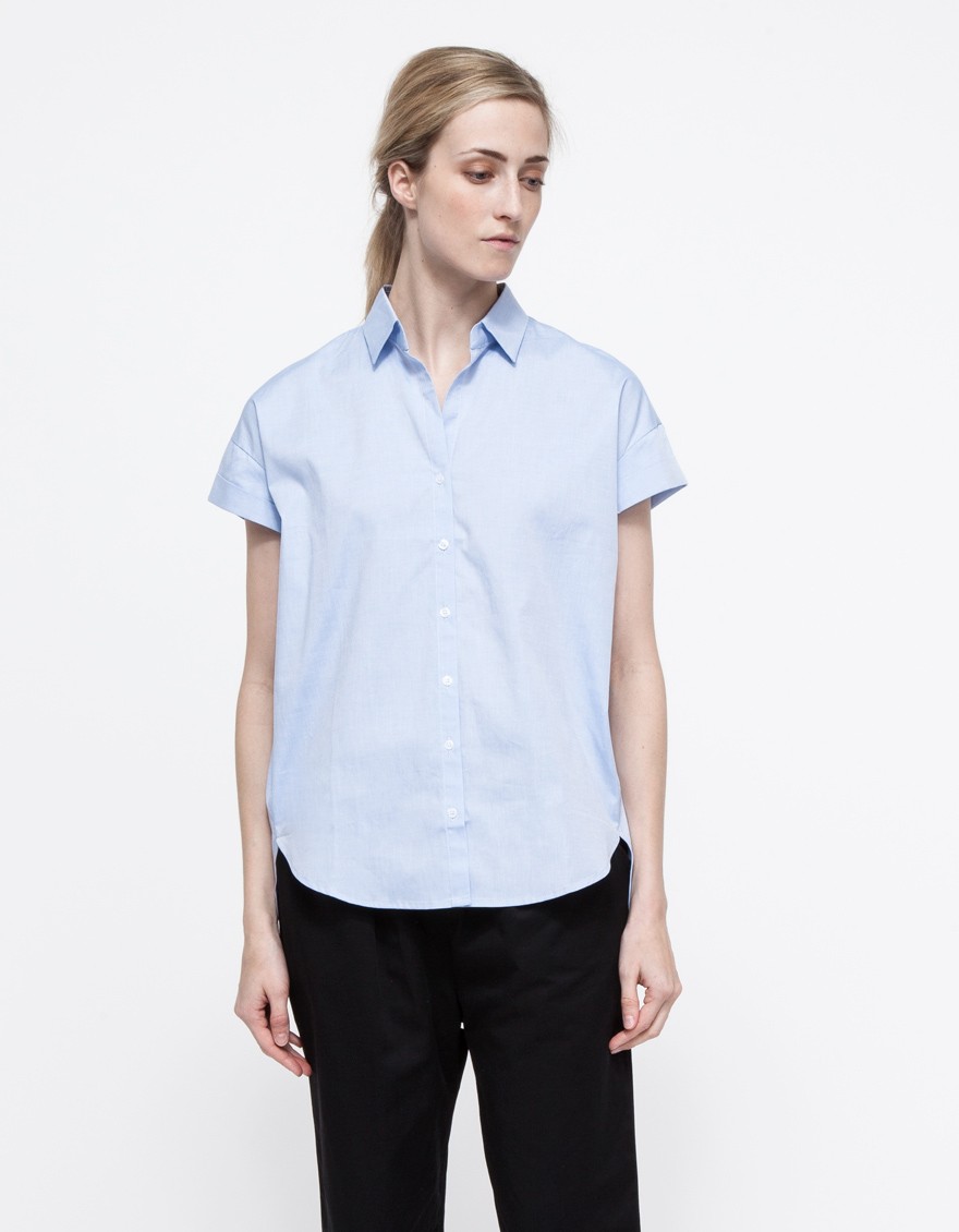 From Stelen, a button front blouse with a geometric cut hemline. Features a rounded front hem, a longer back hem, cuffed sleeves, and a pointed collar with a relaxed, boxy fit.